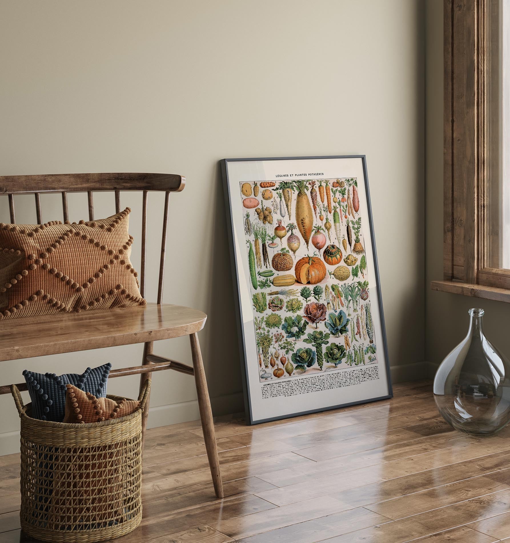 Das Légumes et Plantes Potagères Poster präsentiert eine faszinierende Sammlung von Gemüse- und Kräuterpflanzen in detaillierter Illustration und belebt Küchen mit natürlicher Frische.