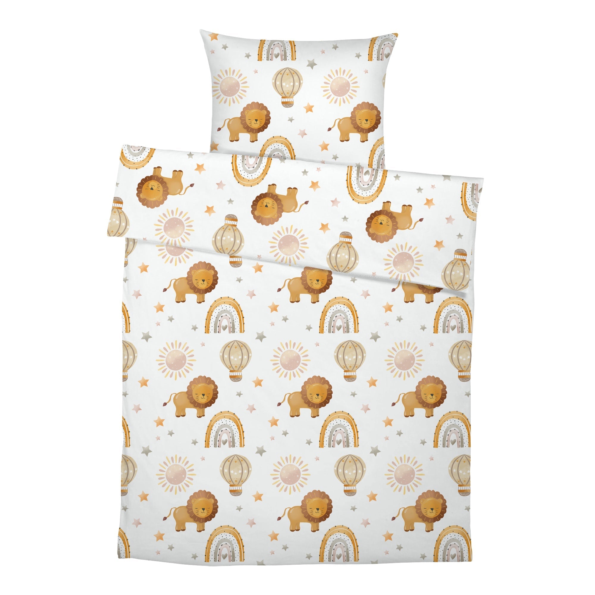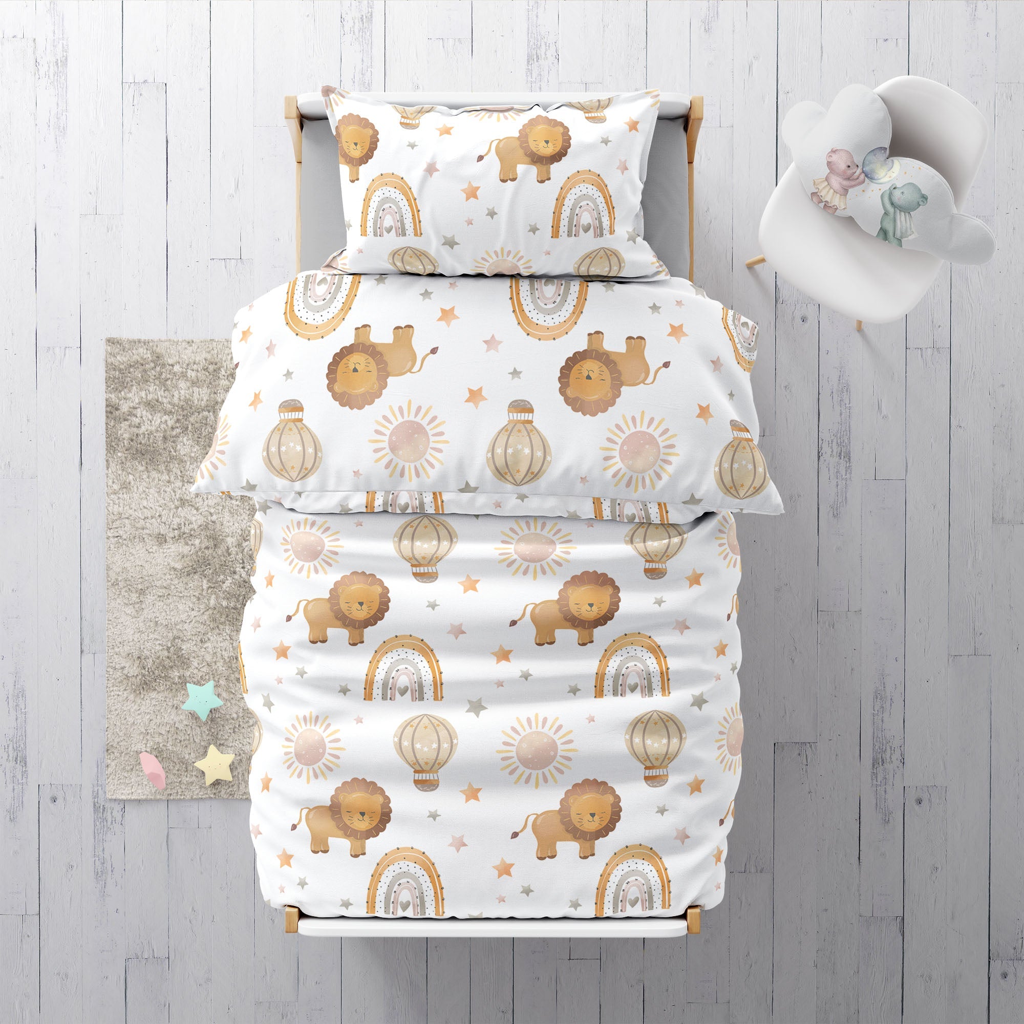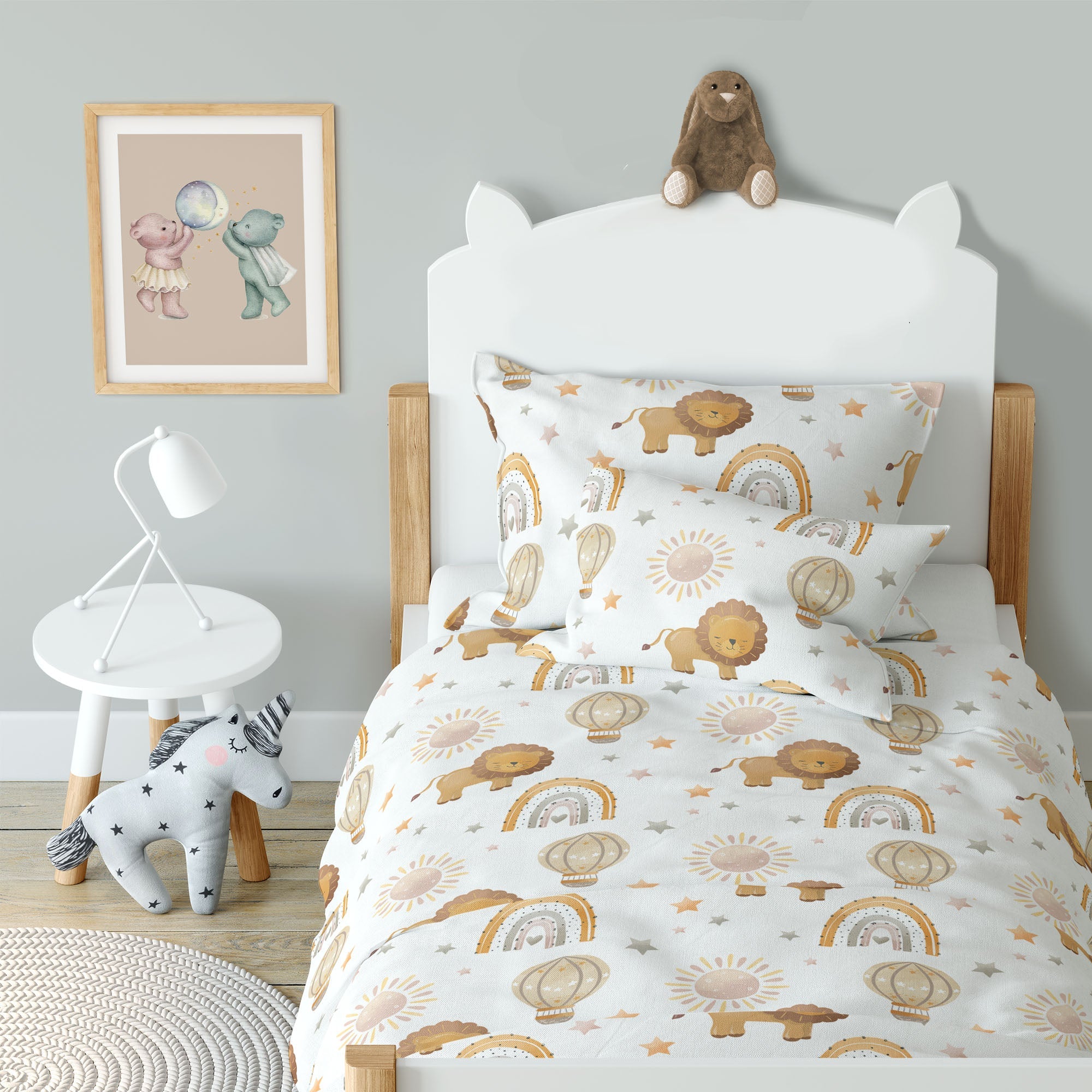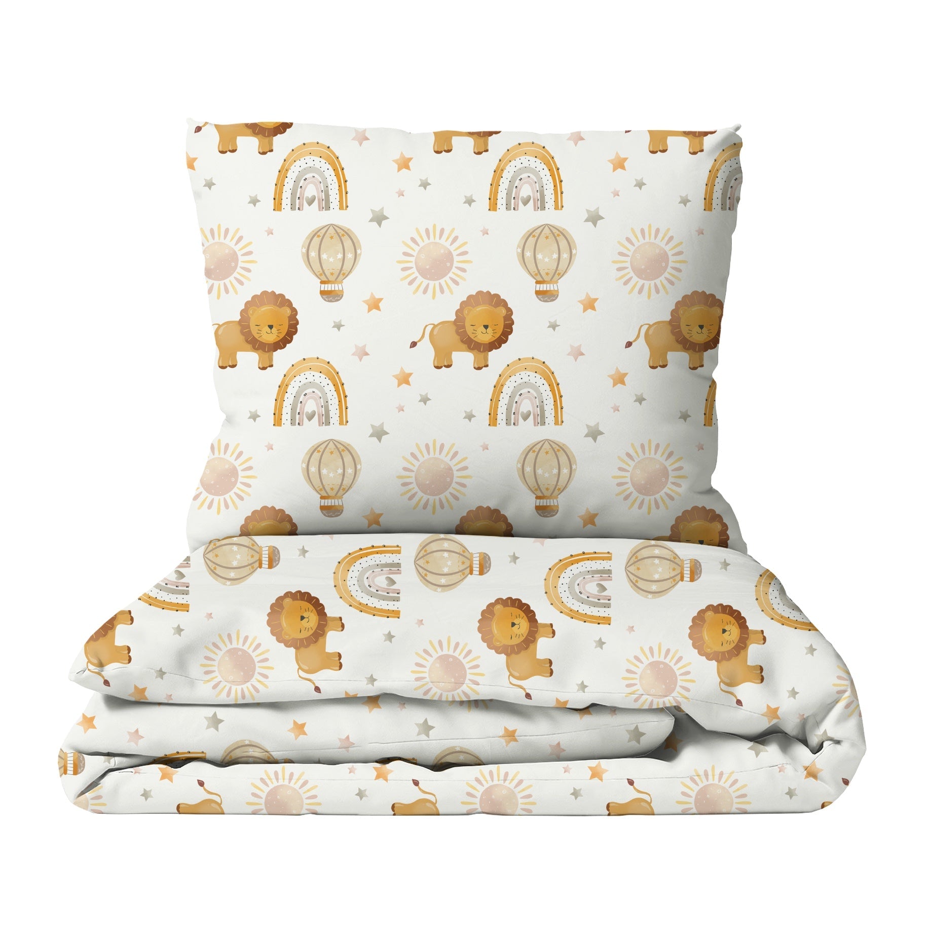 Die Löwe Premium Kinderbettwäsche von Leslis vereint ein liebevoll handgemaltes Löwenmotiv mit zarten Regenbögen – ein ruhiger Blickfang, der kleine Abenteuerfans sanft ins Traumland begleitet.