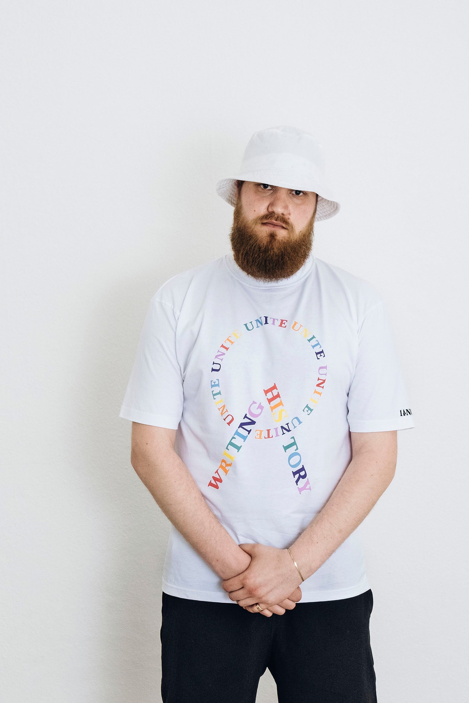 Das farbenfrohe „UNITE“-Design ist ein Blickfang mit Tiefe. Die Message „WRITING HIS/STORY“ steht für Diversität, Gleichberechtigung und gemeinsames Vorangehen. Ein Must-have für alle, die Mode mit Sinn lieben.