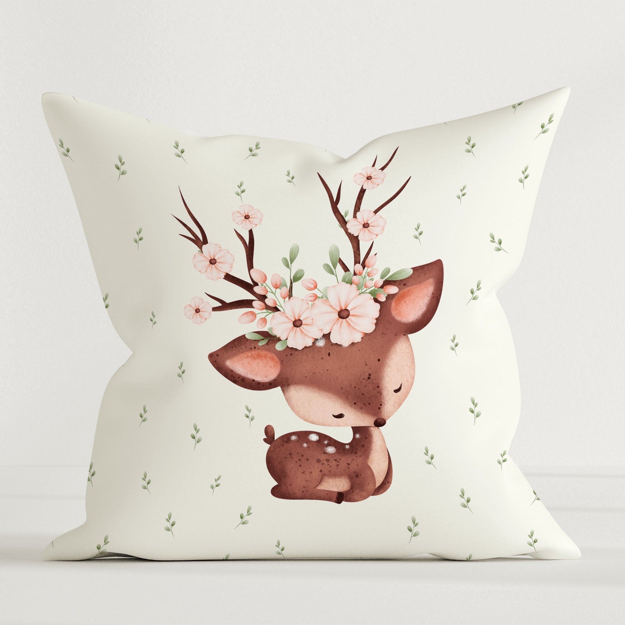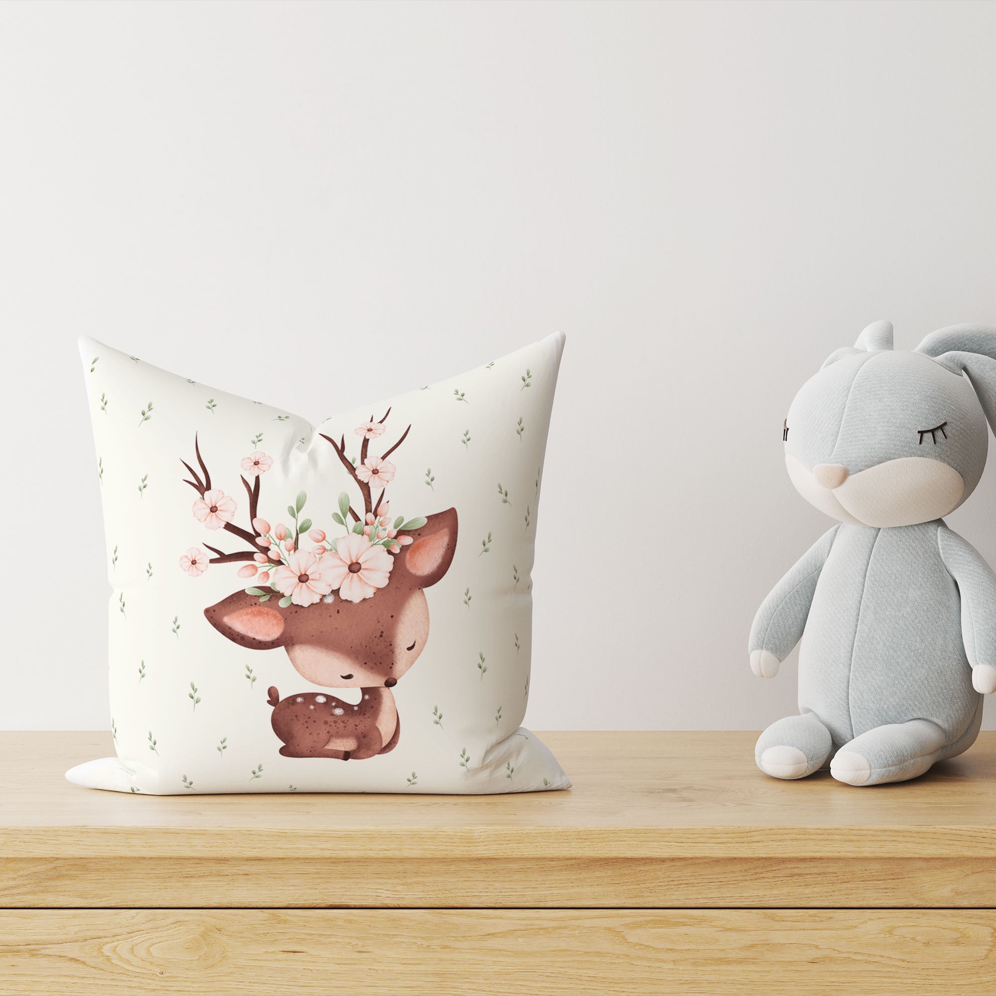 Das Leslis "Reh" Premium Kinder Dekokissen verzaubert mit großen, sanften Augen und zarten Farben – ein kleiner Märchentraum, der Kinder durch den Tag begleitet und in süße Nächte führt.