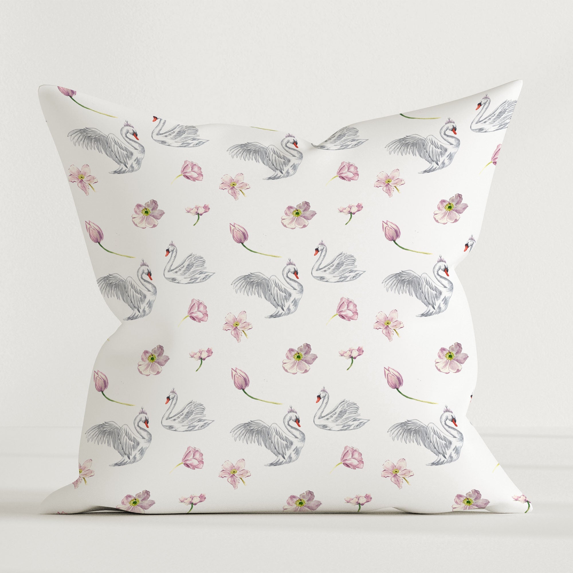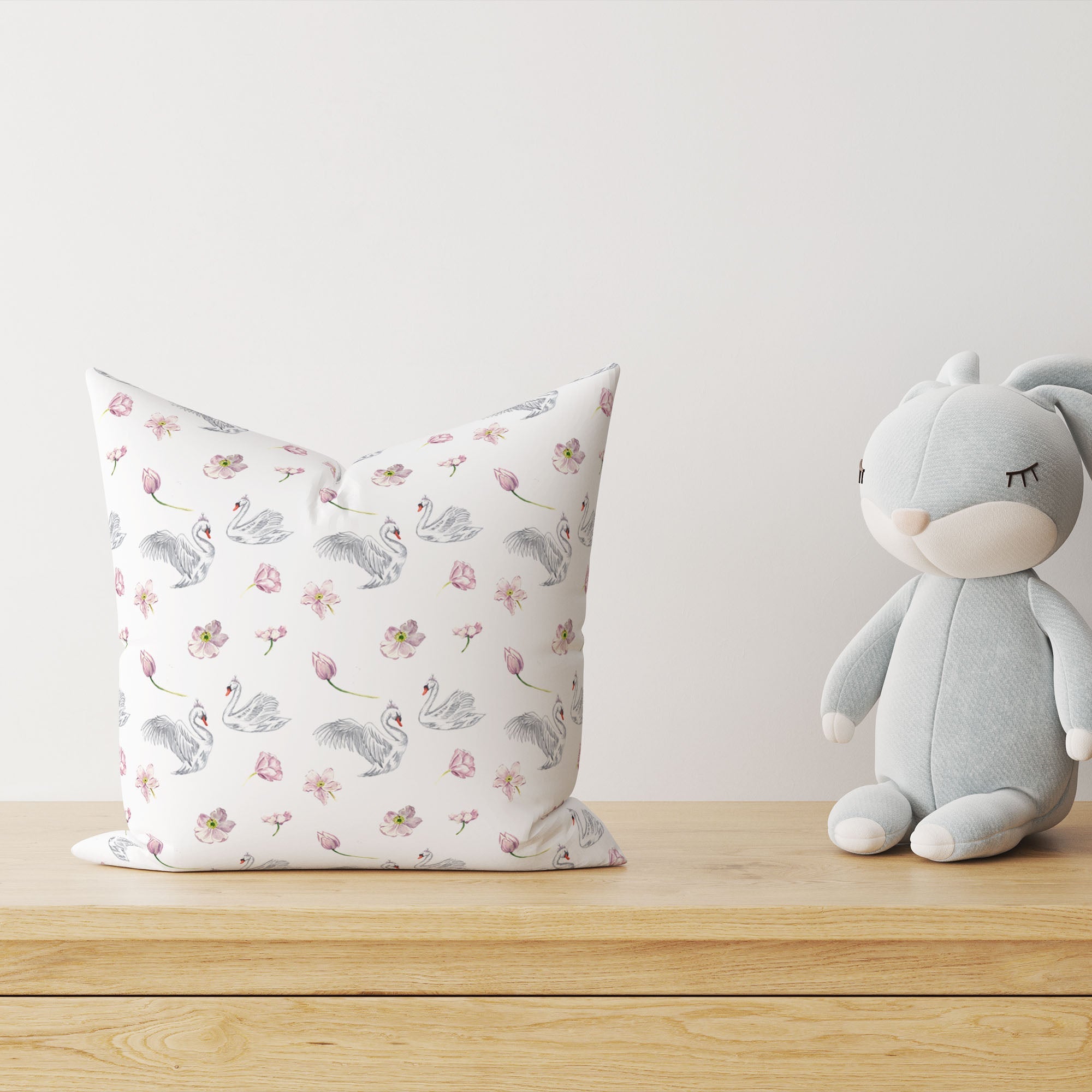 Das „Schwäne“ Premium Kinder Dekokissen bringt elegante Poesie ins Kinderzimmer: fein illustrierte Schwäne tanzen über den Stoff und schaffen eine ruhige, märchenhafte Atmosphäre.