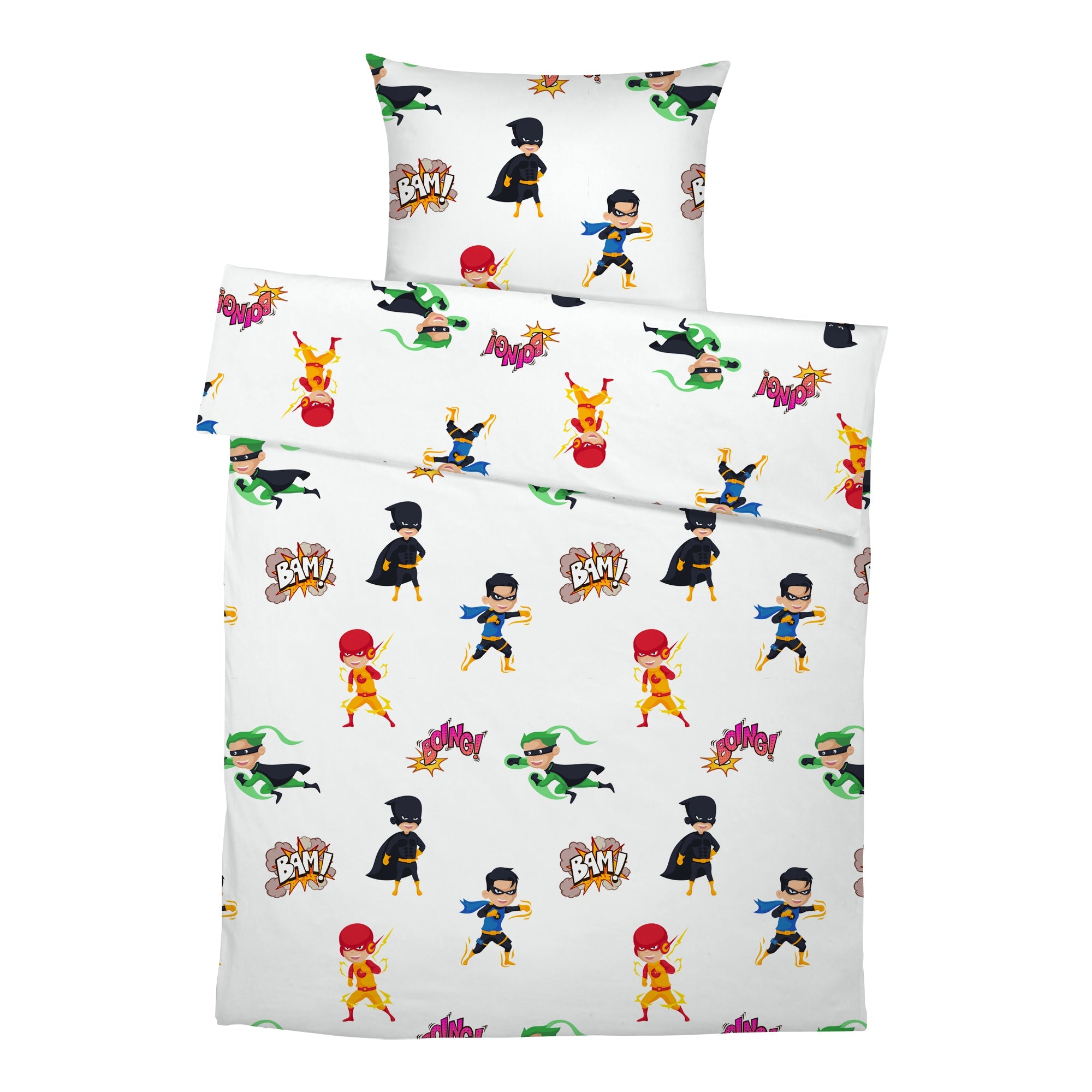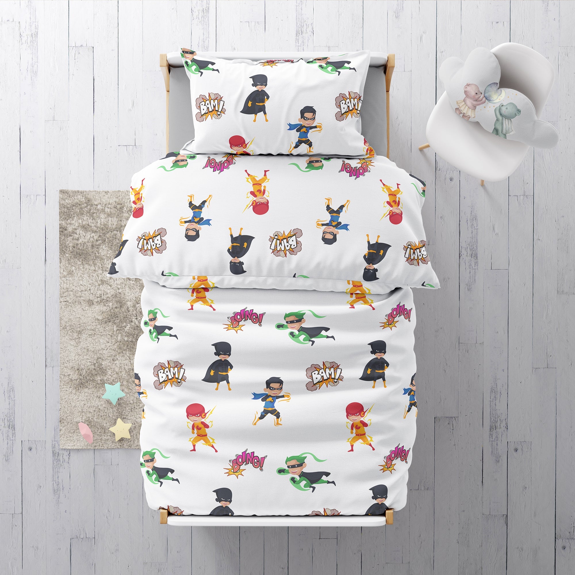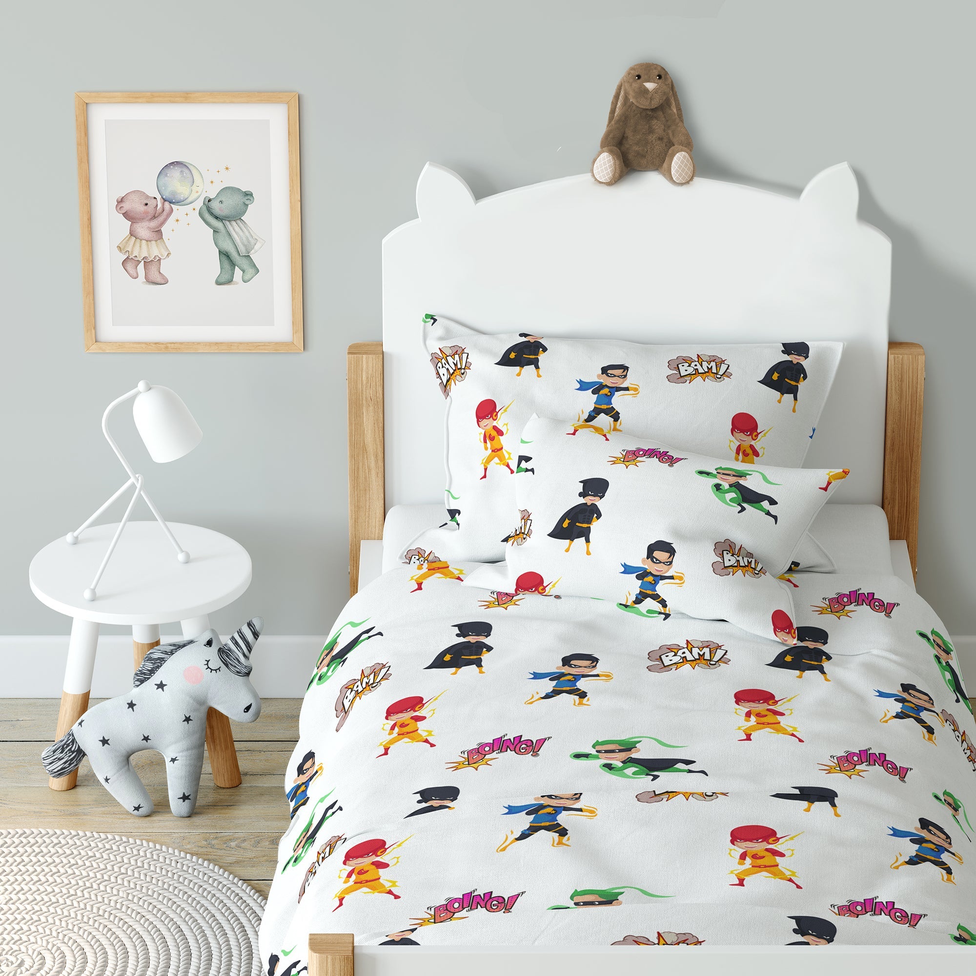 Das Kinderbettwäsche‑Set „Superhelden“ verwandelt das Kinderzimmer in eine Bühne für große Taten: leuchtende Masken, schwebende Umhänge und Symbole voller Energie inspirieren jede Nacht neue Heldengeschichten.