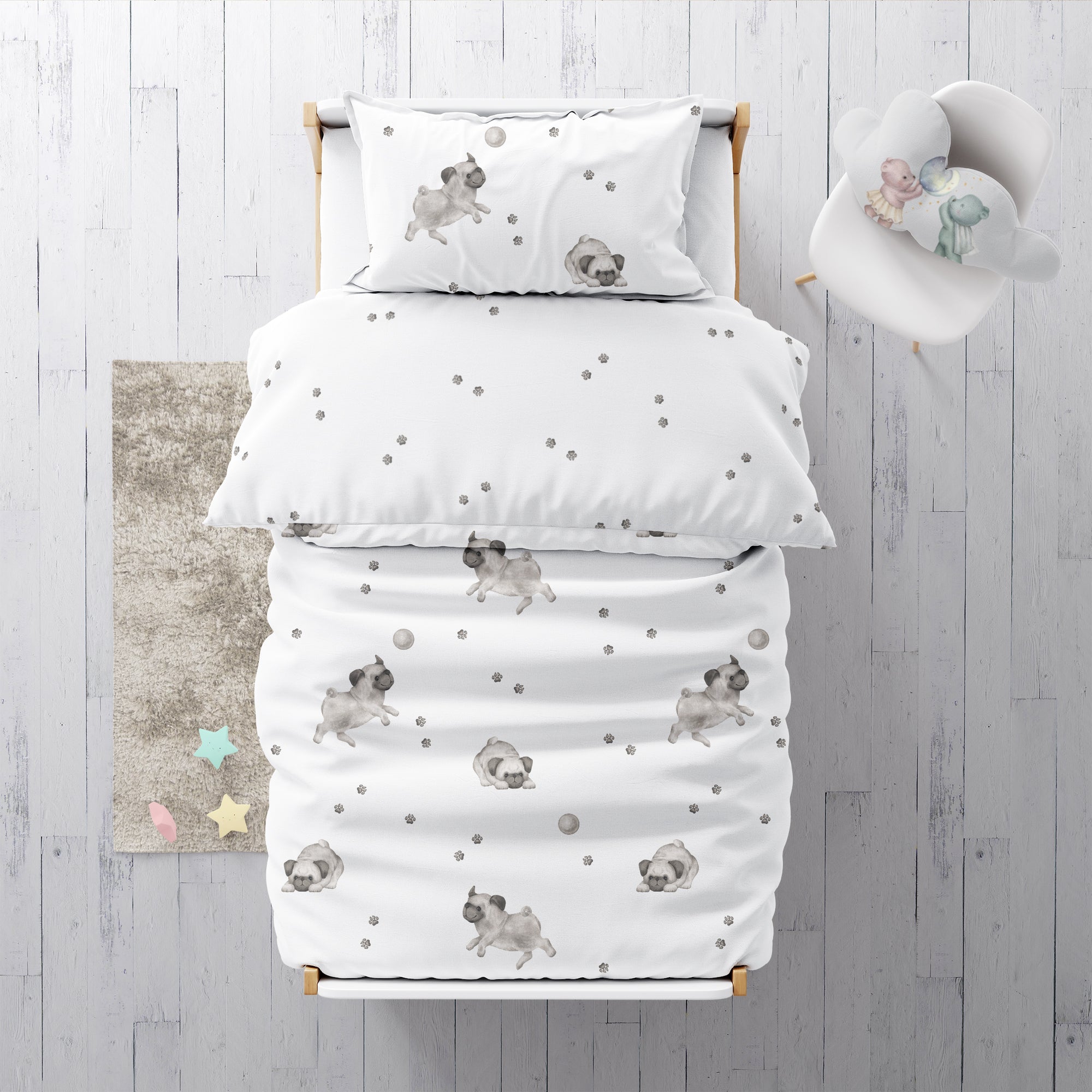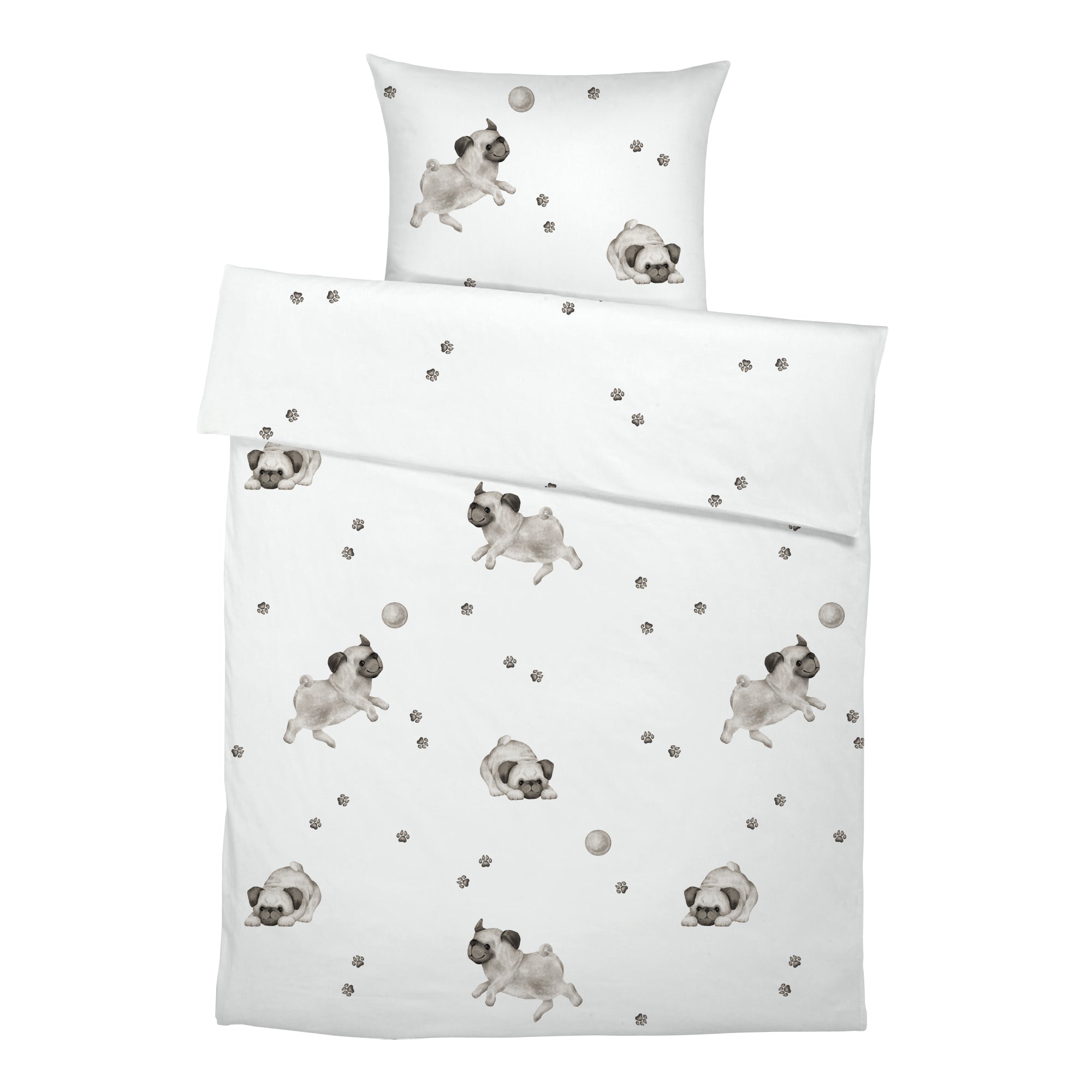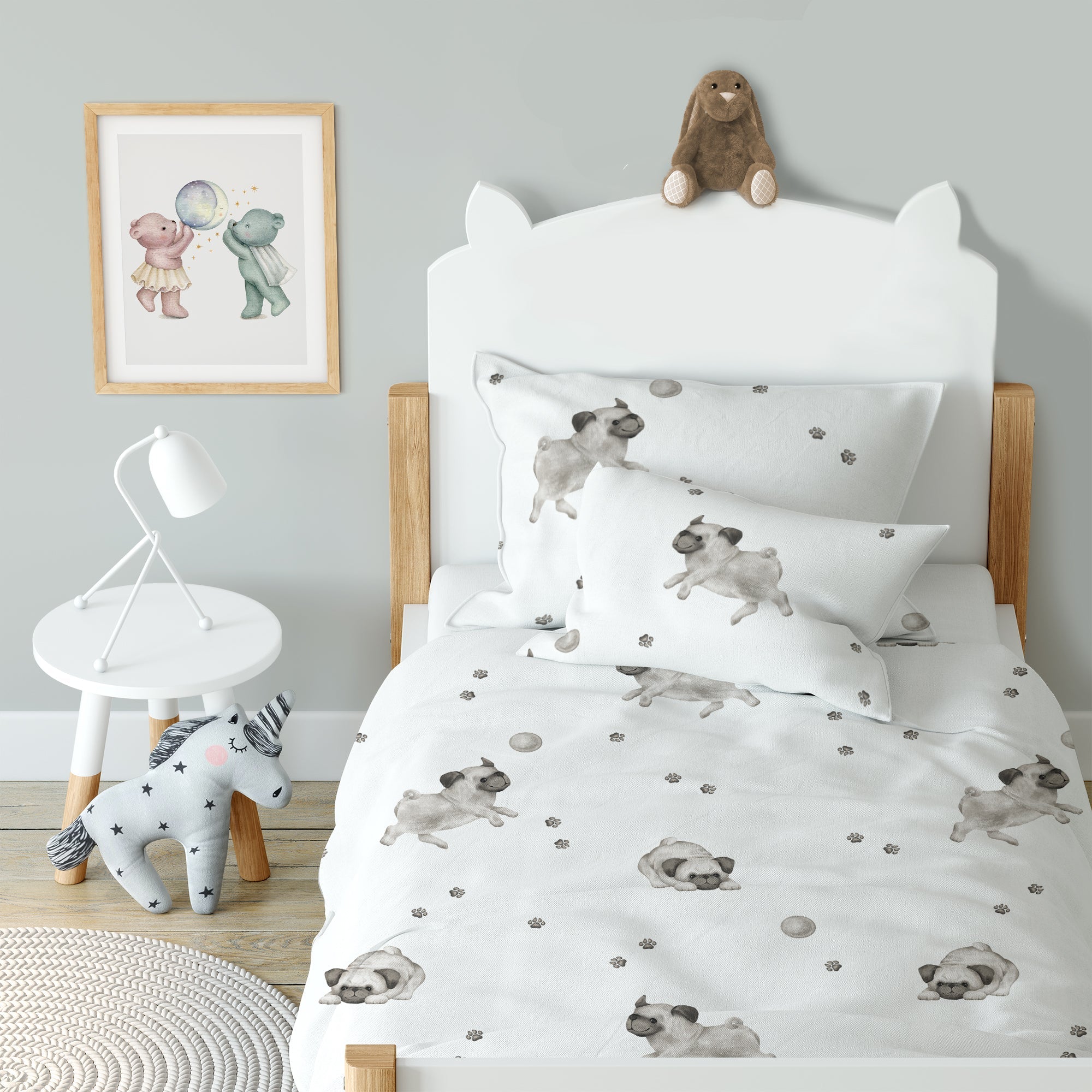 Die Kinderbettwäsche „Süßer Mops“ verbindet spielende Möpse und zart verteilte Pfötchen zu einem fröhlichen, beruhigenden Motiv – perfekt für kuschelige Nächte und fantasievolle Geschichten.