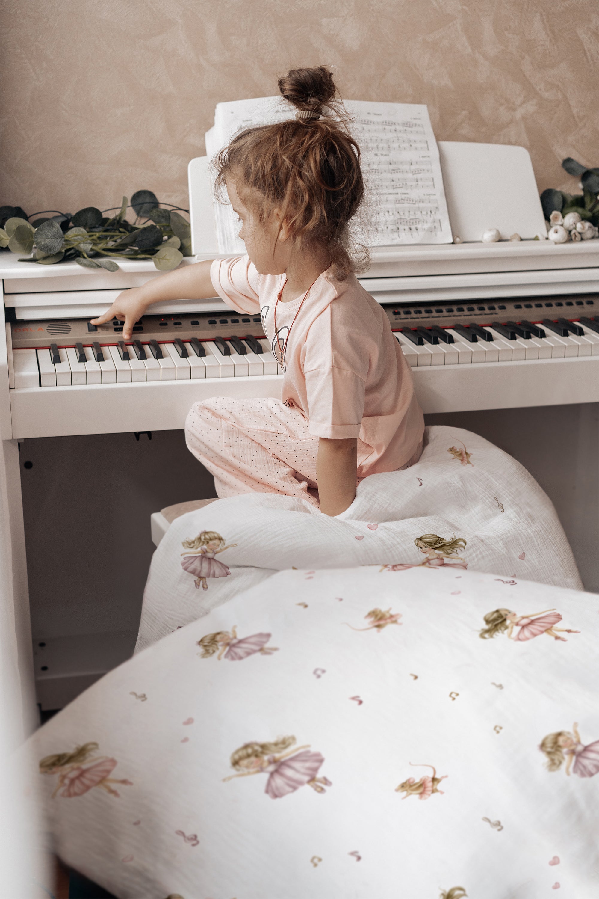 Die Kombination aus 100% Satin‑Baumwolle (glatt, kühl, soft) und 100% Musselin (zweilagig, luftig, cozy) bietet temperaturausgleichenden Komfort und macht die Bettwäsche zum zarten Bühnen‑Statement. Oberflächengefühl: geschmeidig & luftig – angenehm auf empfindlicher Kinderhaut.