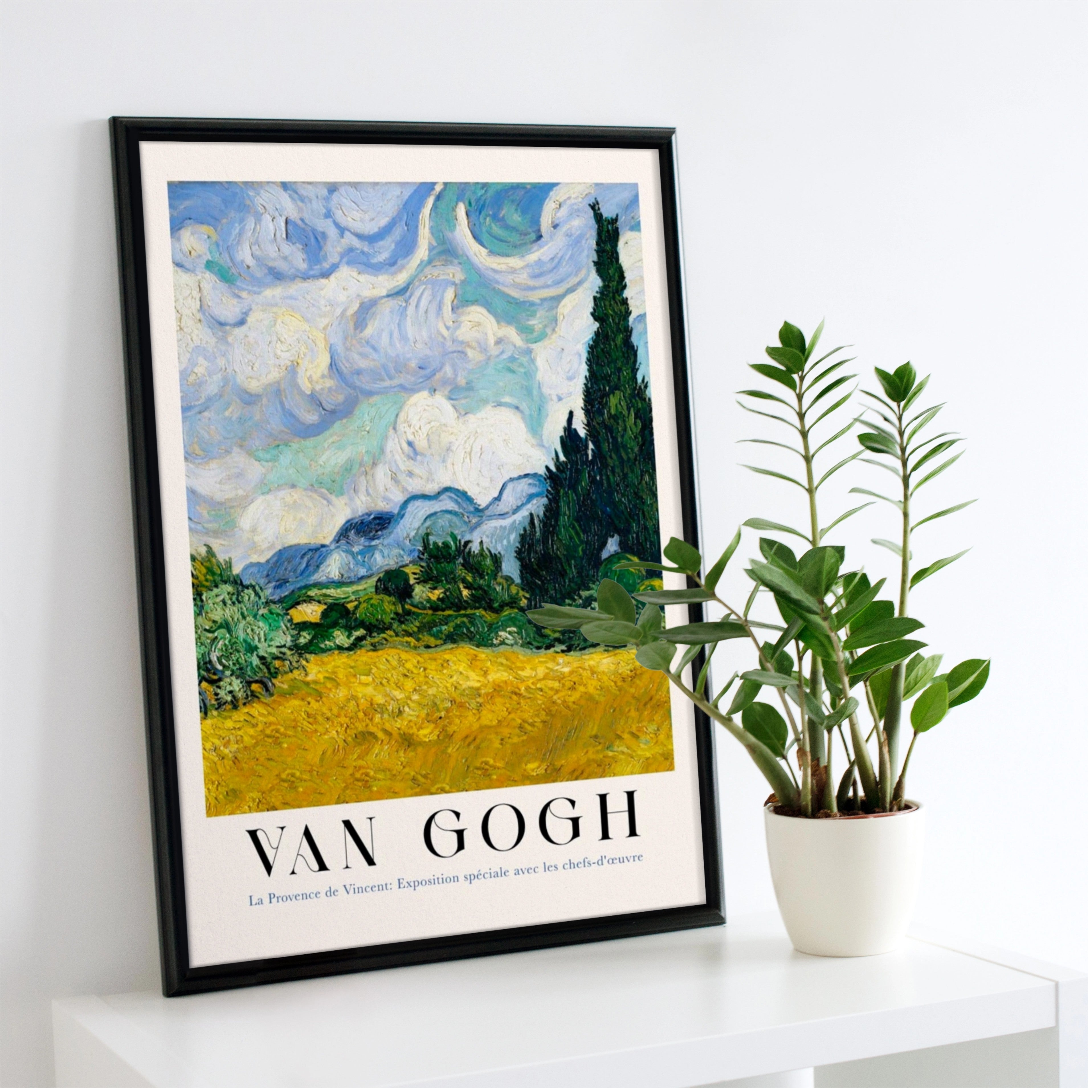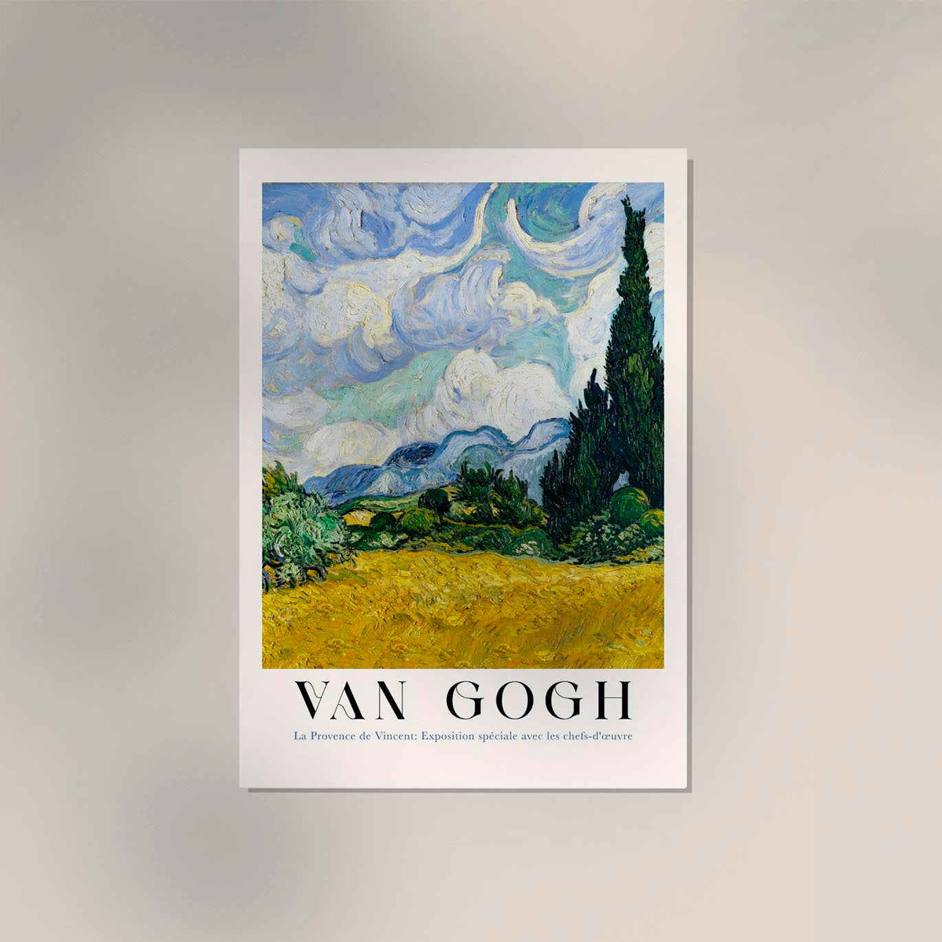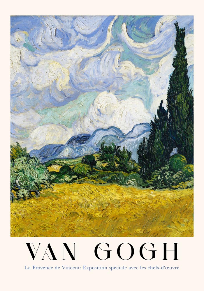 Das Wheat Field with Cypresses (Vertical) – Exhibition Art Poster zeigt eines von Vincent van Goghs faszinierendsten Landschaftsmotiven: die endlosen Weizenfelder der Provence, durchzogen von lebendig wirbelnden Himmelsformen und markanten Zypressen. Diese vertikale Komposition verkörpert Van Goghs unverwechselbare Dynamik und seine tiefe Verbindung zur Natur – ein Ausdruck von Bewegung, Energie und Harmonie.