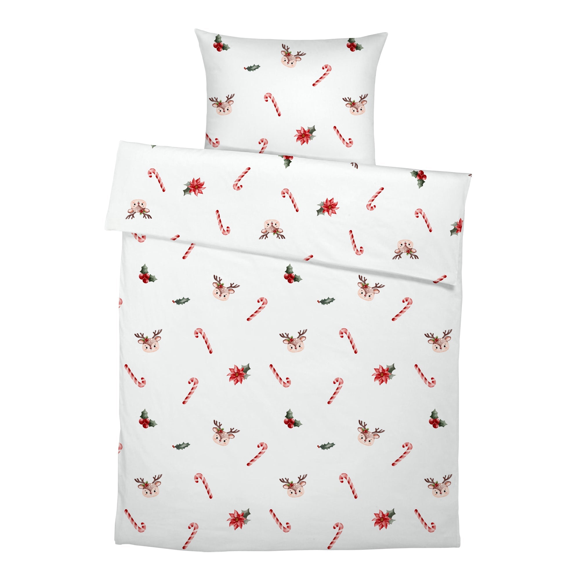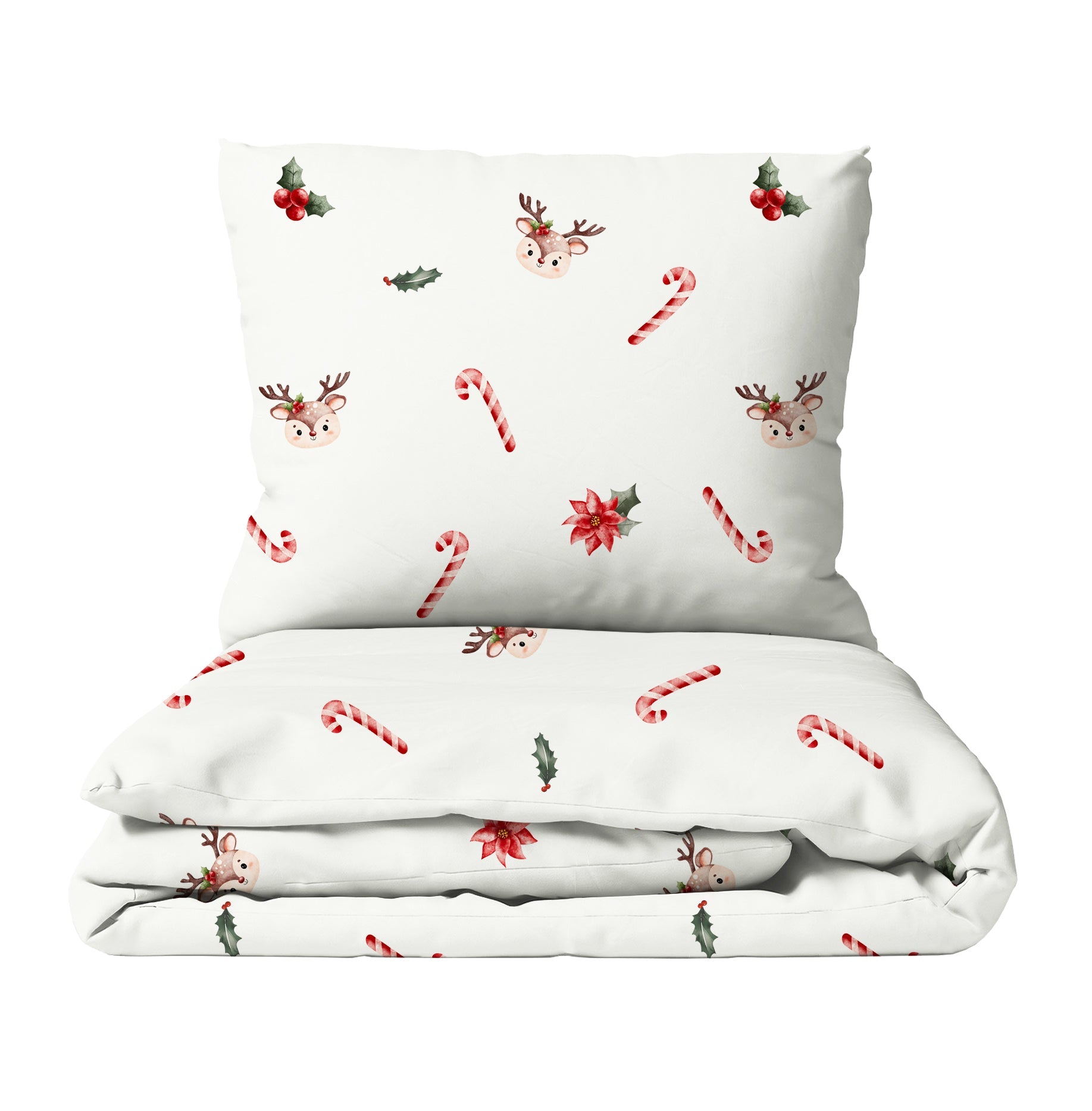 Die „Zuckerstangen und Rehe“ Premium Kinderbettwäsche entführt in eine verspielte Winterwelt: kleine Rehe und süße Zuckerstangen schaffen eine festliche, märchenhafte Atmosphäre im Kinderzimmer.