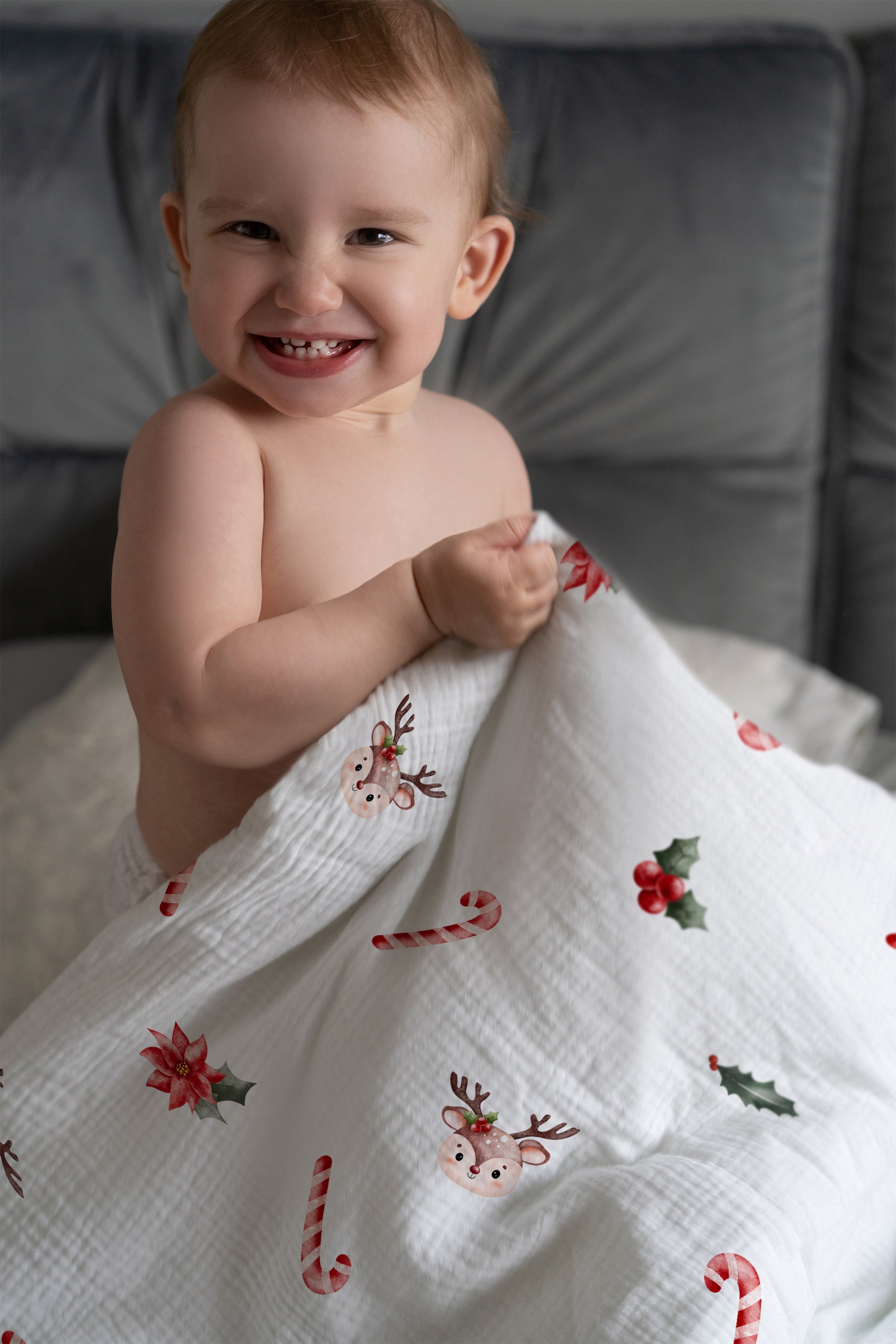 Gefertigt aus OEKO‑TEX Standard 100 zertifizierter Baumwolle und bedruckt mit GOTS‑zertifizierten wasserbasierten Farben, bietet sie weiche, hypoallergene Geborgenheit und langlebige Farbbrillanz – perfekt für kleine Weihnachtsfans und Tierfreunde.